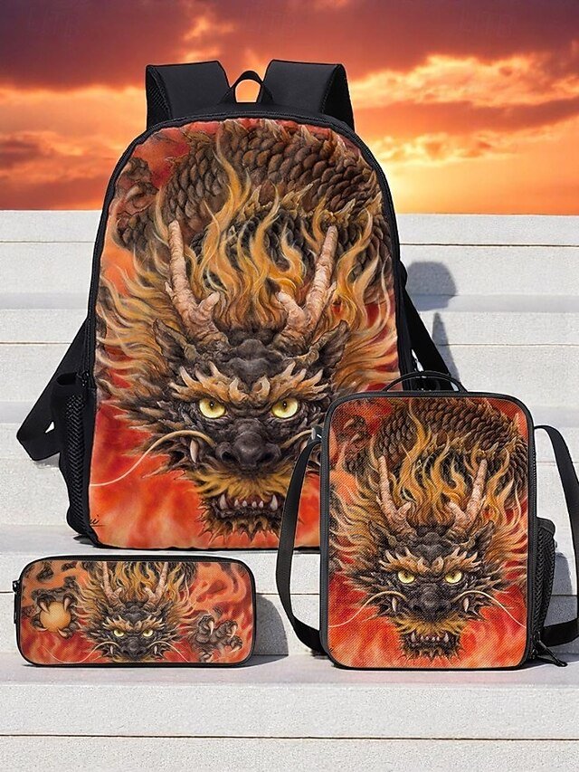 Men’s 3-Piece Dragon Backpack Set with Flame Print –