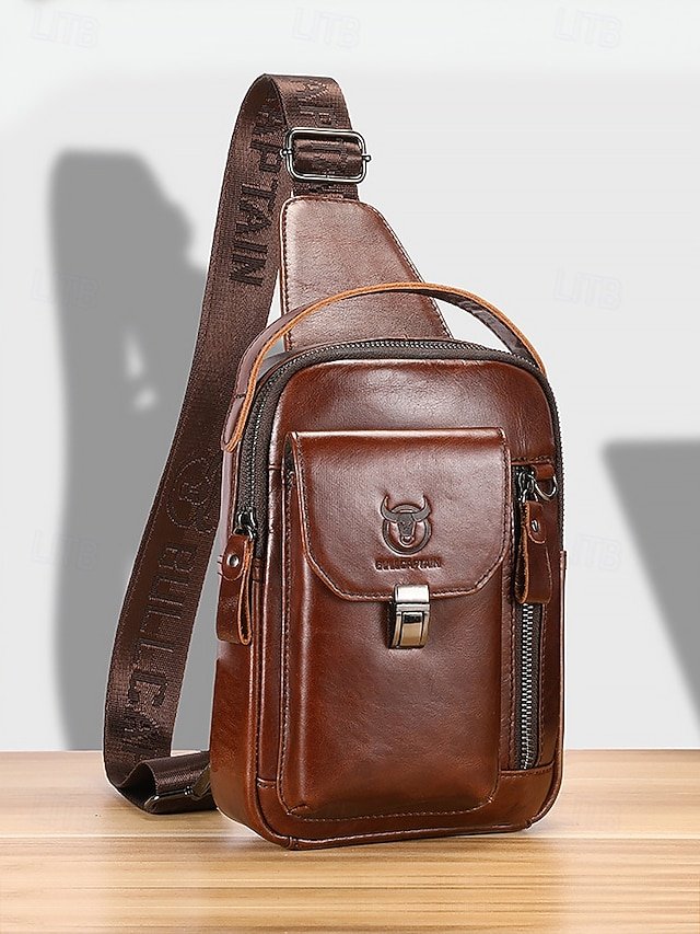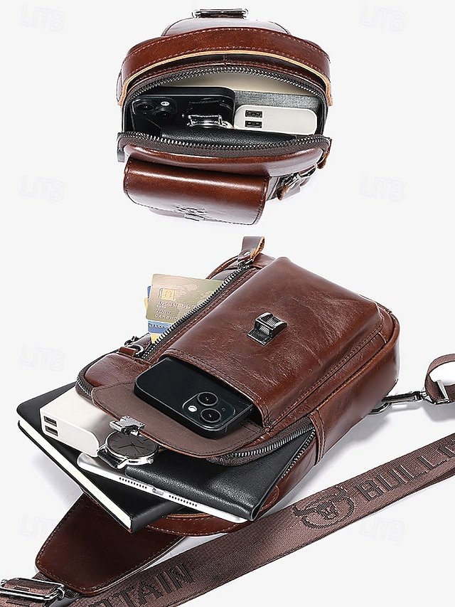 Gender: Men’s, Type: Chest Bag, Shoulder Bags, Material: Leather, Cowhide, Embellishment: Zipper, Multiple pockets, Pattern: Solid Color, Detachable strap: Non-Detachable, Adjustable strap: Adjustable, Occasion: Office, Outdoor, Daily, Width (cm): 8, Height (cm): 31, Length (cm): 17, Function: Waterproof, USB Port, Multi Carry, Category: Crossbody Bag,
