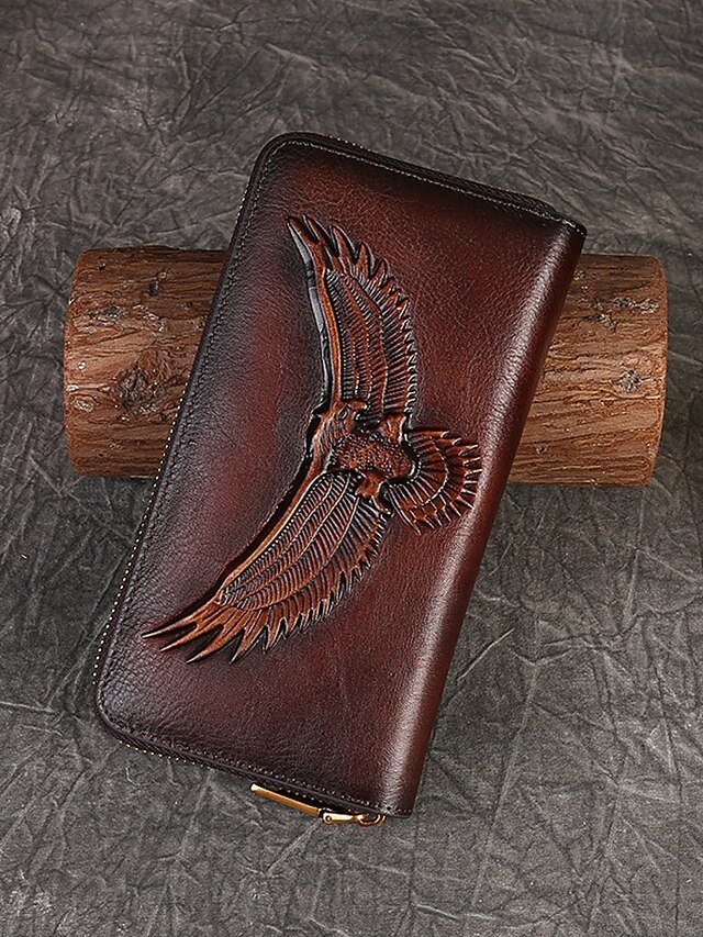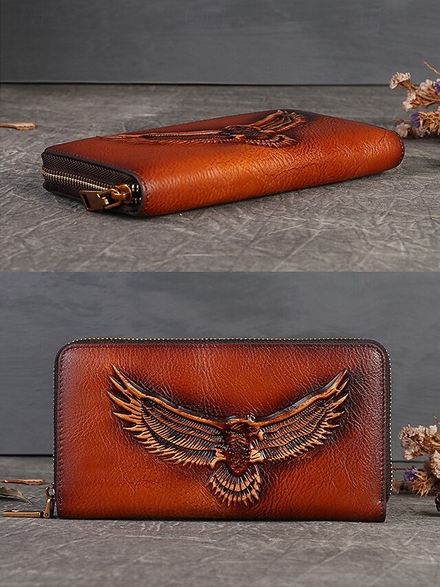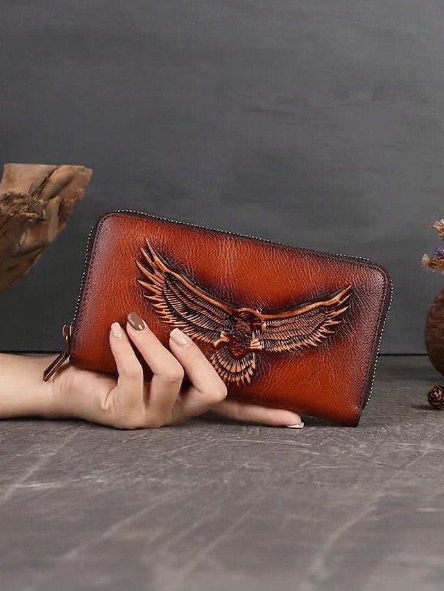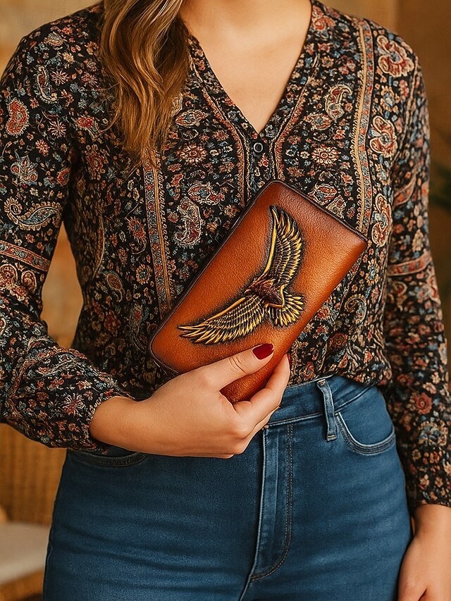 Women’s Genuine Leather Long Wallet with Carved Eagle
